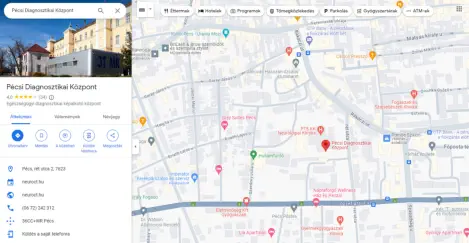 A Pécsi Diagnosztikai Központ gépjárművel és tömegközlekedési eszközökkel egyaránt jól megközelíthető. Intézetünk Pécs belvárosában a Rét utca és a Rákóczi út kereszteződésében a Pécsi Tudományegyetem Idegtudományi tömbjében található. GPS: N46.0729965 E18.2226438